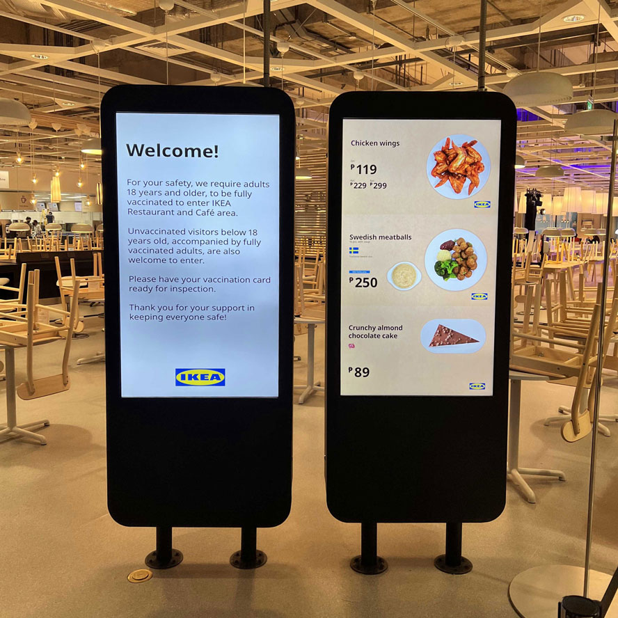 Mediacast Digital Group Inc. a installé 35 lecteurs SMP-2300 de CAYIN, 59 écrans Panasonic de 43 pouces, 7 écrans LG de 55 pouces et 6 bornes interactives dans tout le magasin. L'installation massive de signalisation numérique permet à IKEA Philippines de promouvoir son restaurant auprès des consommateurs en présentant différentes options alimentaires, les dernières offres, promotions et publicités. Des mets sélectionnés sont également présentés sur les écrans numériques qui fonctionnent comme des menus pour promouvoir davantage l'appétence et la déliciosité de chaque article auprès des visiteurs.