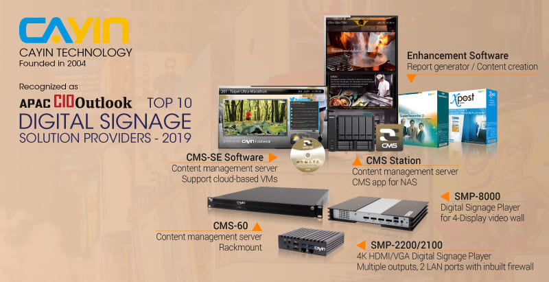Les applications d'affichage numérique ont prospéré avec le grand bond de la technologie des écrans depuis 2000, faisant des applications d'affichage numérique un marché en constante croissance et diversifié. CAYIN Technology, fondée en 2004, a pleinement témoigné du développement de l'affichage numérique. En se concentrant sur les besoins des clients et en intégrant de manière transparente de nouvelles technologies, CAYIN a non seulement élargi sa gamme de produits, mais a également rapproché ses applications des besoins des différentes industries. CAYIN a été largement reconnu par les clients et a réussi à établir une valeur de marque. En 2019, CAYIN a l'honneur d'être reconnu comme l'un des dix principaux fournisseurs par APAC CIO Outlook, qui est à l'avant-garde de la fourniture de solutions d'affichage numérique et qui impacte l'industrie.