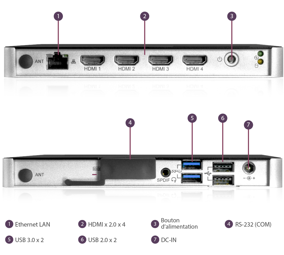 Débit binaire et résolution : Jusqu'? 4 x FHD (1080p) 10M 20fps Jusqu'? 1 x 4K (UHD) 50M 30 fps / 15M 60 fps *Nous recommandons l'utilisation de fichiers vidéo au format H.264 pour une meilleure performance de lecture. *Il n'est pas recommandé de lire des vidéos 4K en mode Clone/Extended/Distinct, car les résultats pourraient ne pas être ? la hauteur des attentes.