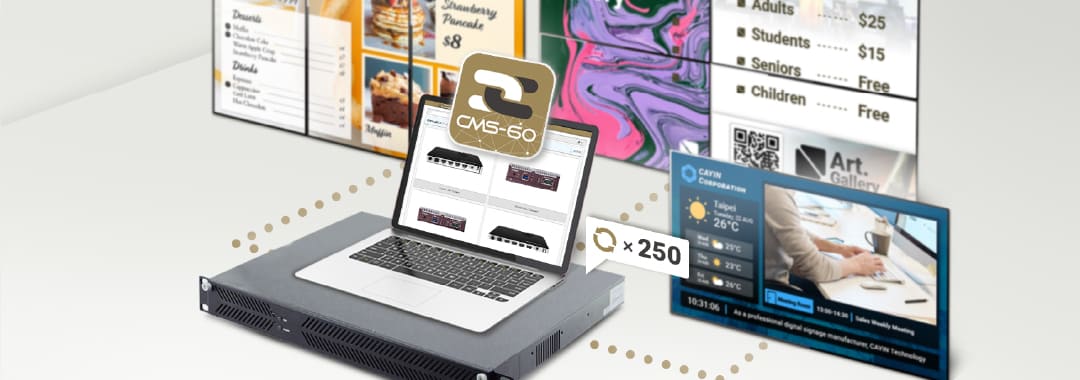 Le CMS-60 peut transmettre des données en continu via une carte de capture HDMI externe (vendue séparément) aux lecteurs au moyen de la diffusion LAN, de la diffusion multiple ou de la diffusion unique. il permet également le divertissement multimédia le plus récent pour les réseaux d'affichage numériques.