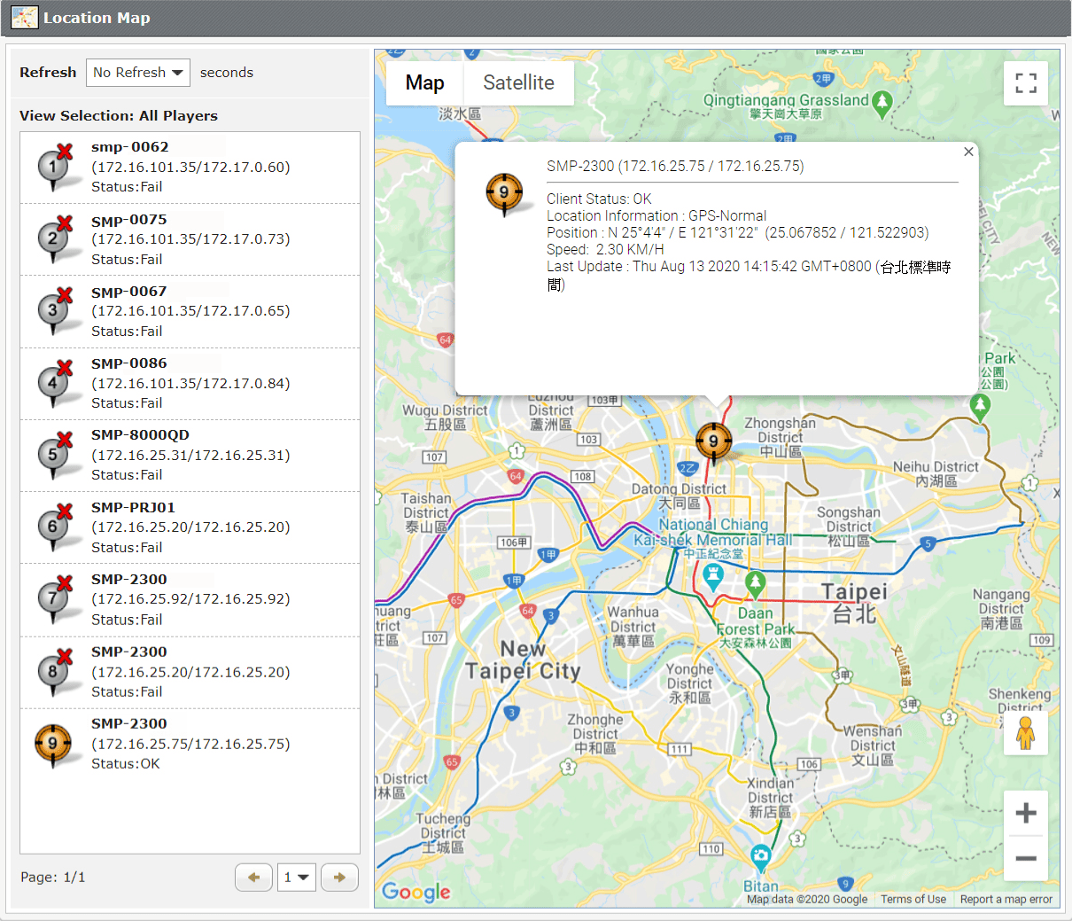 Connectez-vous au Gestionnaire Web du CMS et cliquez sur LECTEUR dans le menu principal. Ensuite, tous les lecteurs SMP connectés ? ce serveur CMS seront répertoriés ici. Vous pouvez vérifier le nom du lecteur, l'adresse IP, l'état de fonctionnement, ainsi que la disponibilité du GPS.