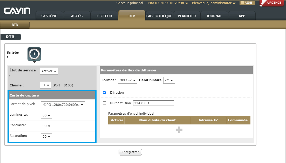 - Diffusion : Si vous activez la diffusion, le flux en direct sera envoyé ? tous les lecteurs SMP via le port 8100.